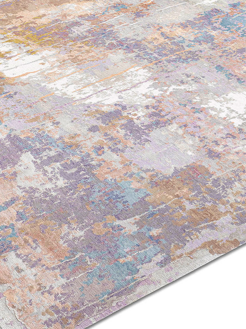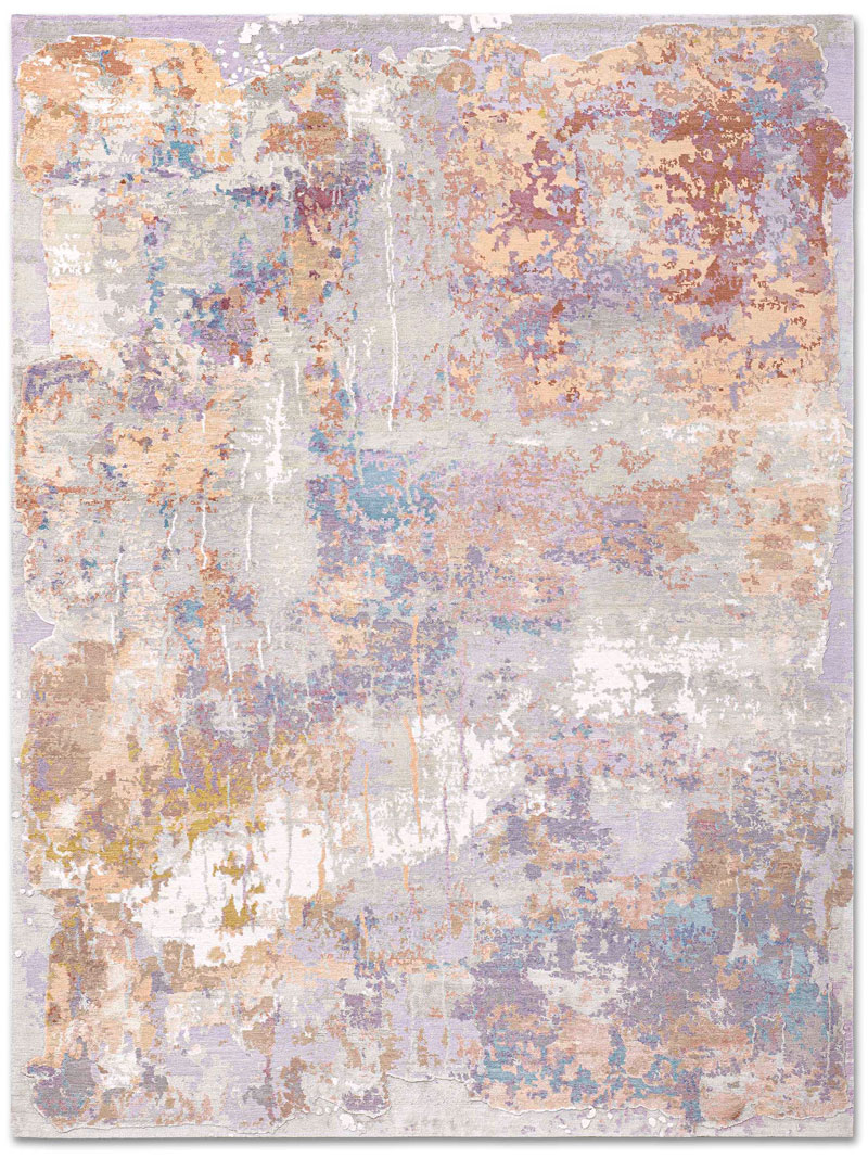 Ковер ручной работы из шерсти и шелка. Поверхность имеет высокую/низкую текстуру, где мы обрезаем определенные поля шерсти, чтобы создать топографию материала и текстуры. Плотность ковра 9/9