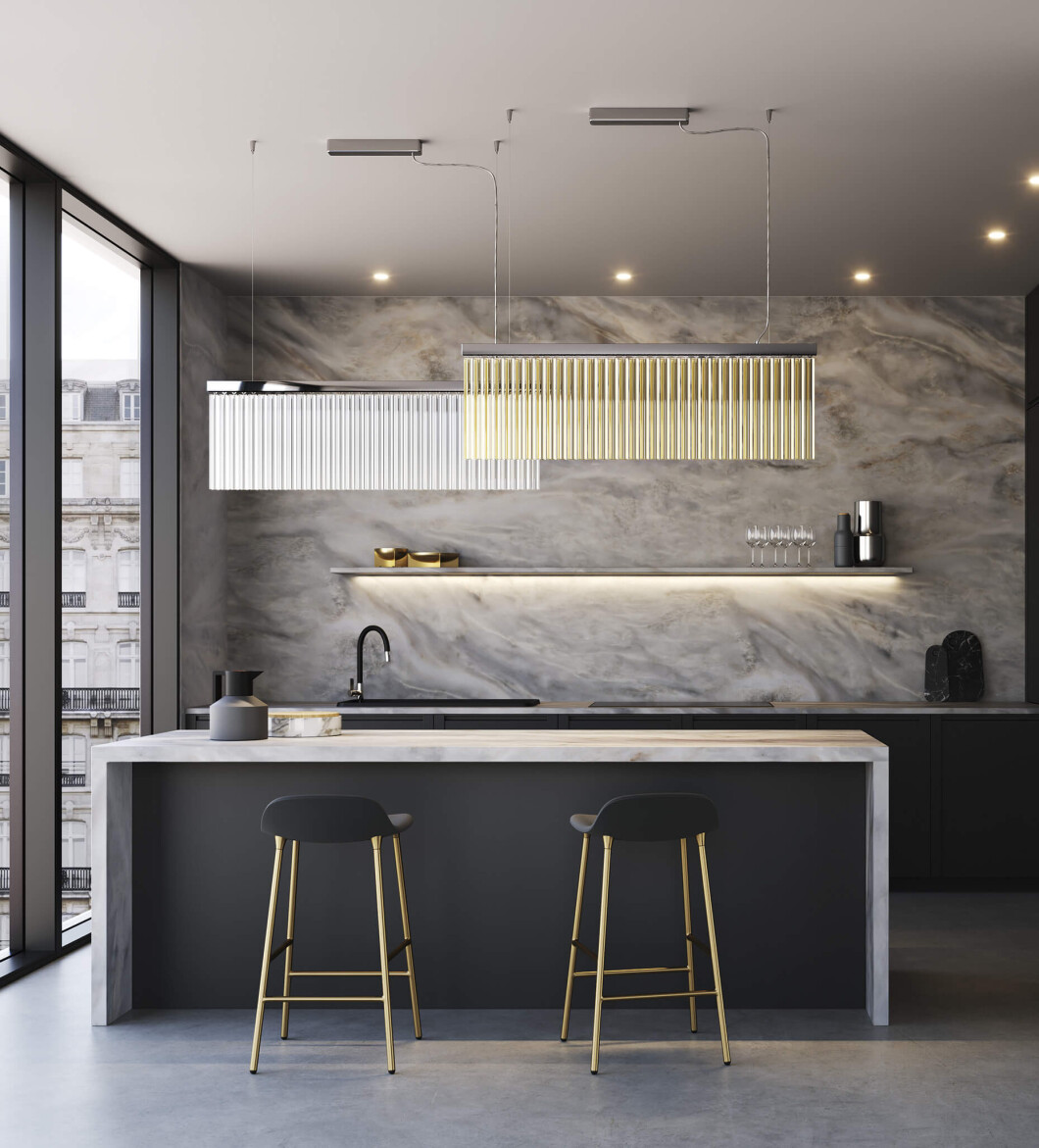 Подвесной стеклянный светильник с металлическим каркасом Carmen имеет три конфигурации. Вы можете выбрать модель с прямым, круглым, или извитым основанием, к которому крепится прозрачная пластина из объемного волнистого стекла. Цельная конструкция изделия и лаконичный дизайн делают его универсальным и подходящим под любое интерьерное решение. Круглый вариант люстры выполнен из двух стеклянных пластин прозрачного и коричневого цветов. Для освещения предусмотрена светодиодная лампа мощностью 80 Вт.