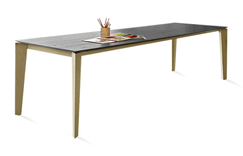 Обеденный стол Cruz – простая классическая конструкция раскладки и современный дизайн Daniele Molteni. Отлично подойдет для кухни или столовой зоны. Каркас выполнен из стали в цвете античная латунь (M328), столешница в шпоне, тонировка угольный дуб (L038 Charcoal oak veneer). Стол может быть с раскладкой или без раскладки. Столешница эллиптическая, бочкообразная, прямоугольная на выбор: шпон, шпон с краями из массива, массив дерева, глянцевое или устойчивое к царапинам стекло, натуральный мрамор, суперкерамика, супермрамор. Вариант с круглой столешницей – стол без раскладки. Можно заказать круглую столешницу с центральной вращающейся частью из стекла или супермрамора.