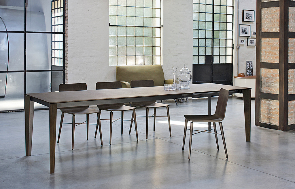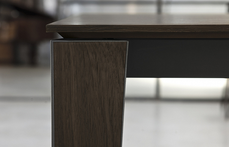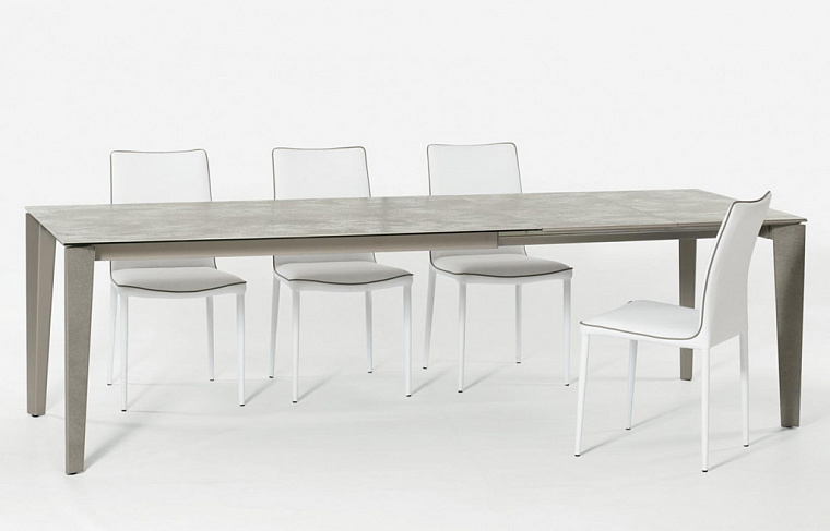 Senso – прямоугольный стол с раскладкой. Одна из самых вместительных моделей – при полной раскладке за обеденным столом может разместиться 10-12 человек (в зависимости от размера стола). Каркас стола – лакированная сталь. Варианты выбора материала для столешницы: шпон, стекло (в том числе устойчивое к царапинам), супермрамор, суперкерамика. Senso – прекрасная возможность для создания индивидуального дизайна благодаря тому, что ножки стола могут быть декорированы вставками из шпона, стекла.