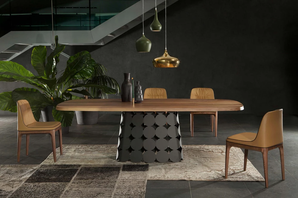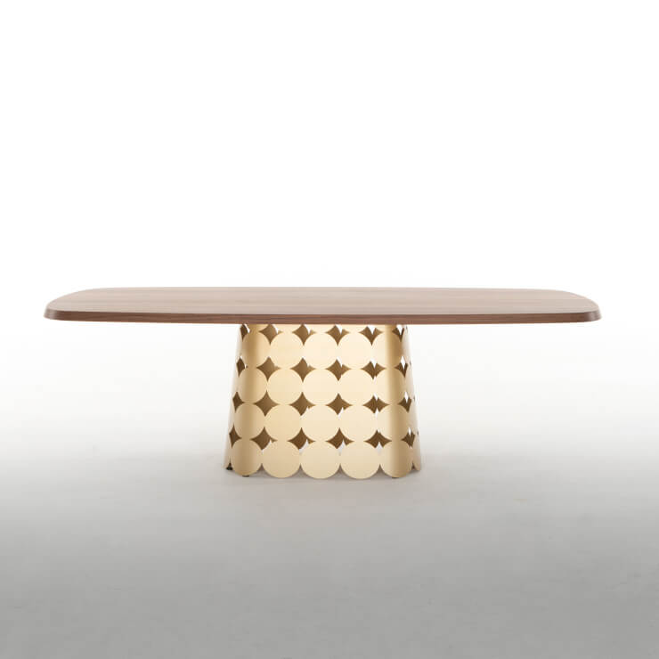 Вдохновленные природными мотивами дизайнеры Tonin Casa создали стол Pois. Стол имеет необычное основание, где играют свет и тень, точно так же, как лучи солнца проникают в листья растений. Цвет основания – белый, темно-серый или матовое золото. Столешница доступна в шпоне, массиве дерева или керамике, в различных цветах.