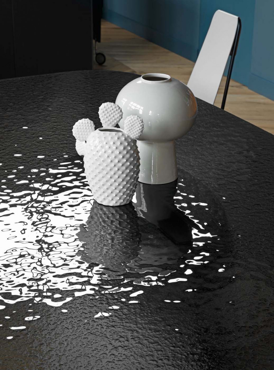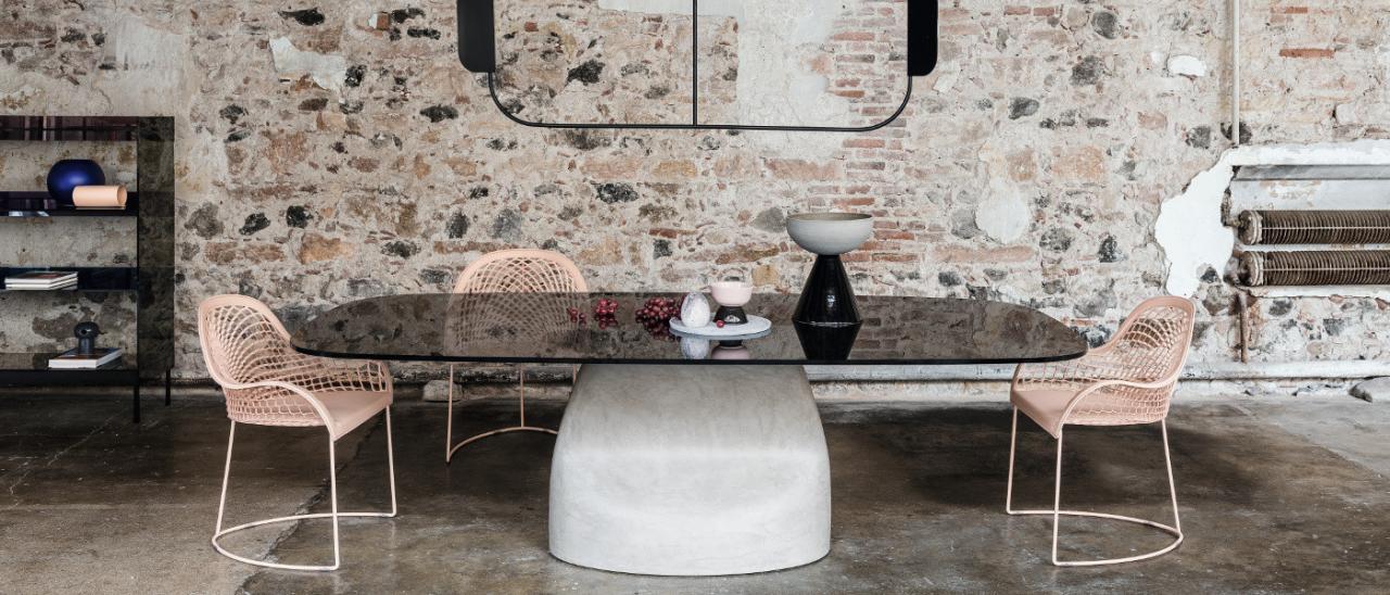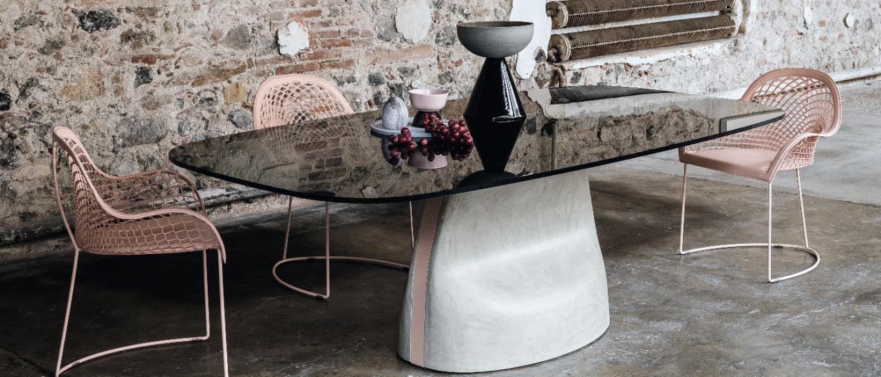 Стильный, эффектный стол от Андреа Лукателло, монолитность основания которого уравновешивается легкостью столешницы. Основание представлено в версии Baydur или матовый бетон и дополнено вставкой из лакированной стали. Прямоугольная столешница с закругленными концами выполнена из хрусталя и является полностью функциональной.