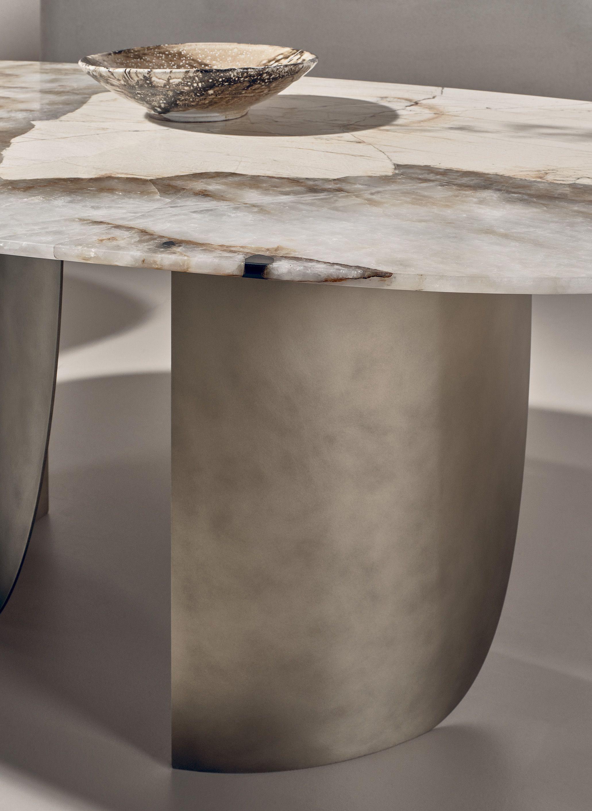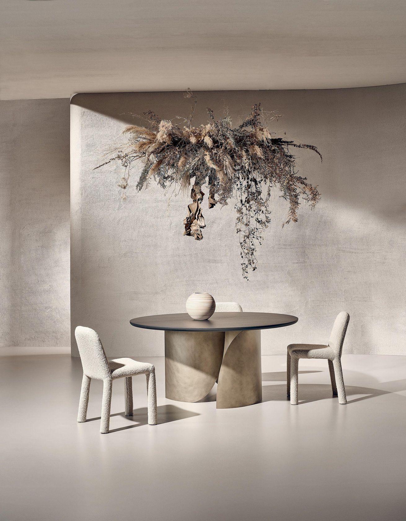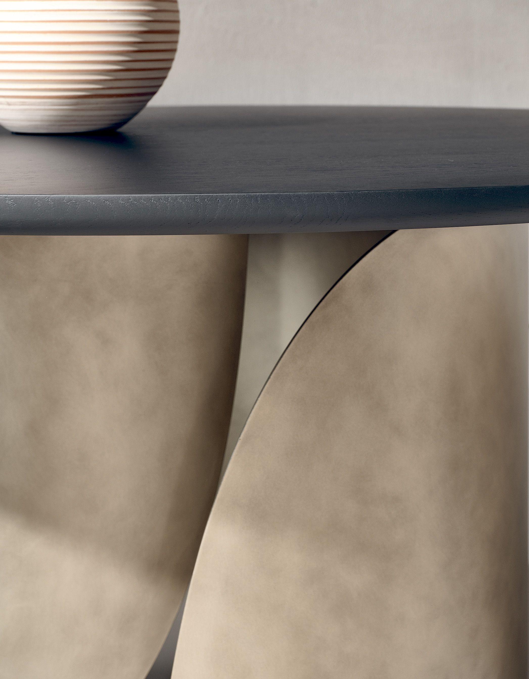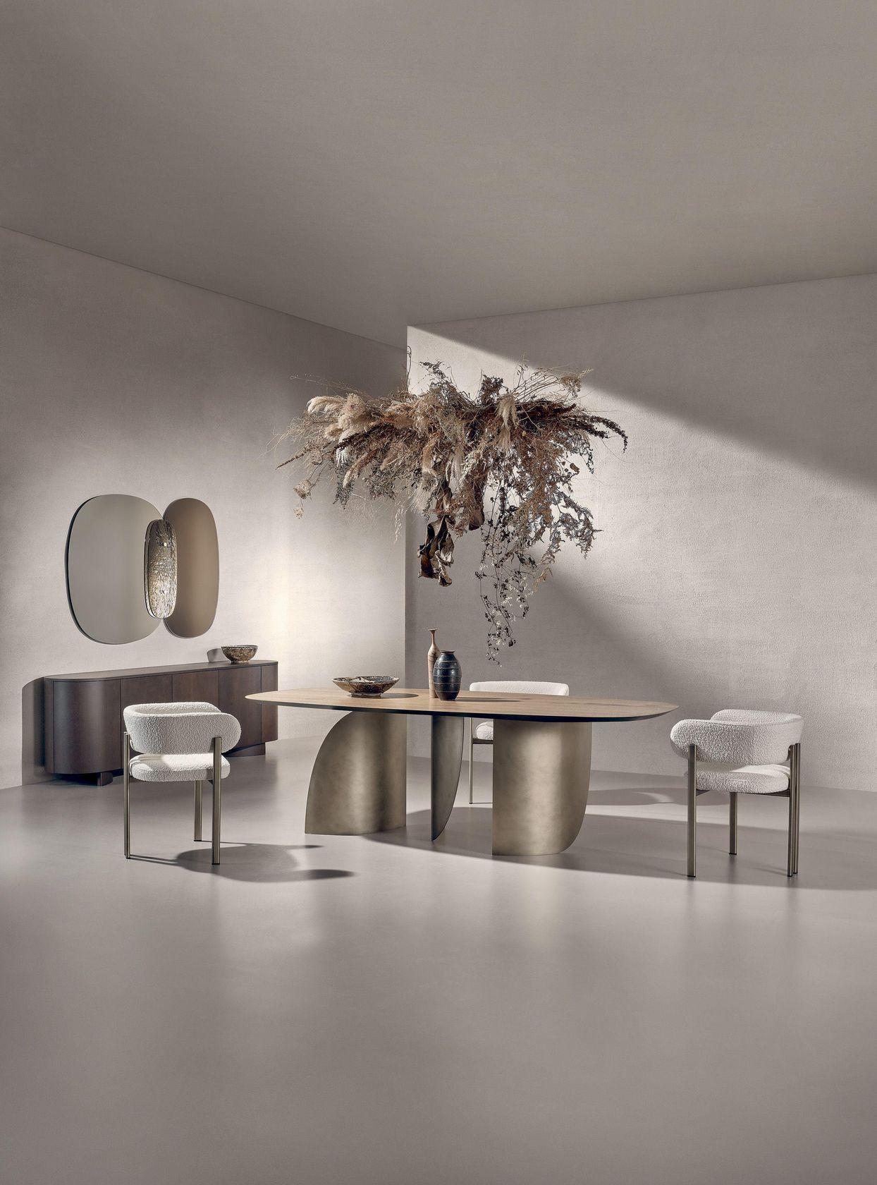 Стол обеденный Sail от фабрики Nature Design выглядит очень стильно и необычно. У него большая столешница круглой или овальной формы. В основании ― радиусно изогнутые панели причудливых очертаний.