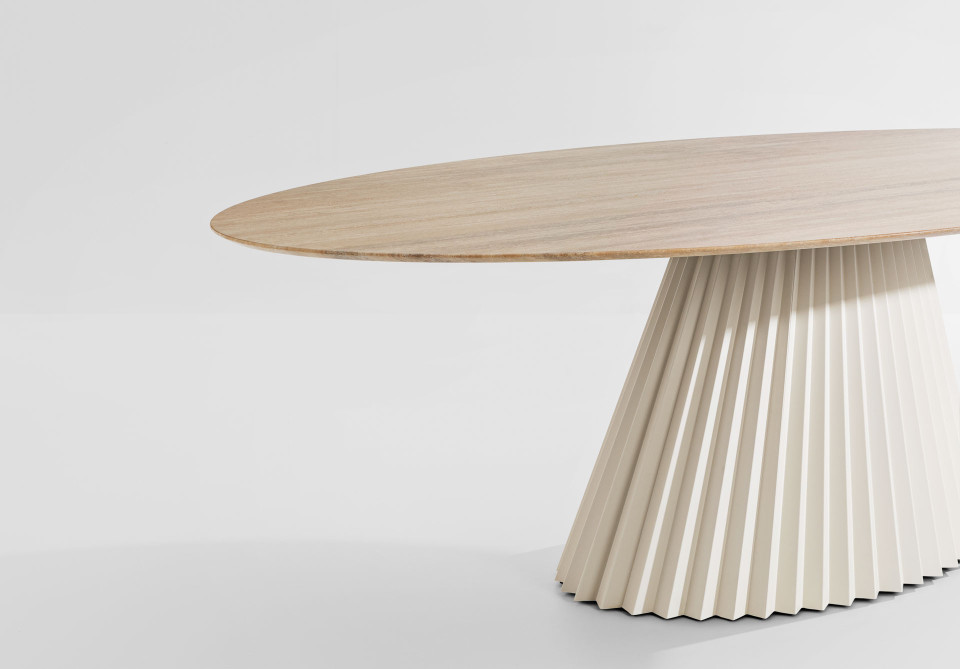 Эллиптическая столешница, доступная в размерах 220x120 см и 250x120 см, представлена ​​в дереве, хрустальной керамике и мраморе, предлагая как щедрое пространство поверхности, так и вневременную элегантность. Идеально подходящий для жилых помещений, конференц-залов и контрактных помещений, эллиптический стол Plissé сочетает в себе художественный дизайн с практичной функциональностью, добавляя нотку эксклюзивности.