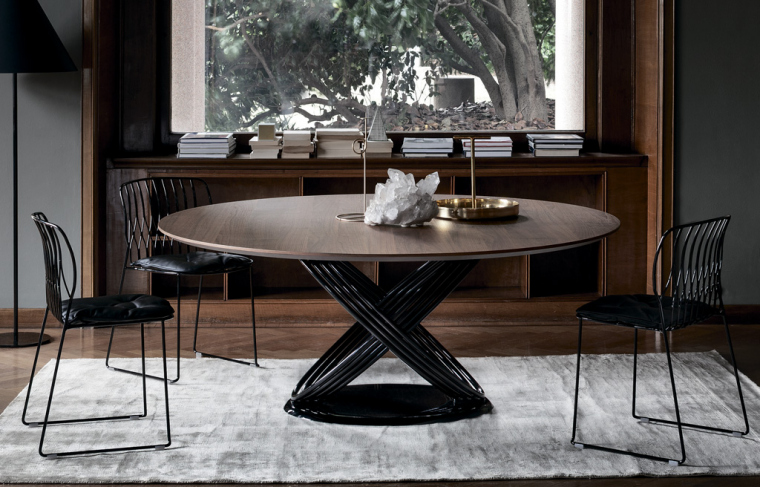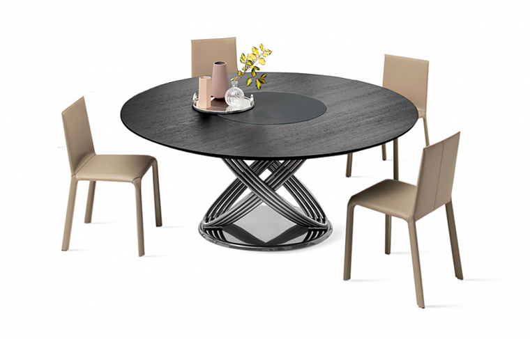 Круглый обеденный стол Fusion от Bontempi Casa без раскладки предназначен для гостиной или объединенной зоны столовой и гостиной. Структура выполнена в виде системы колец из стали с лакированной отделкой. База на выбор: лакированная сталь, шпон или супермрамор. Варианты для исполнения столешницы: шпон; стекло; стекло, устойчивое к царапинам; супермрамор.