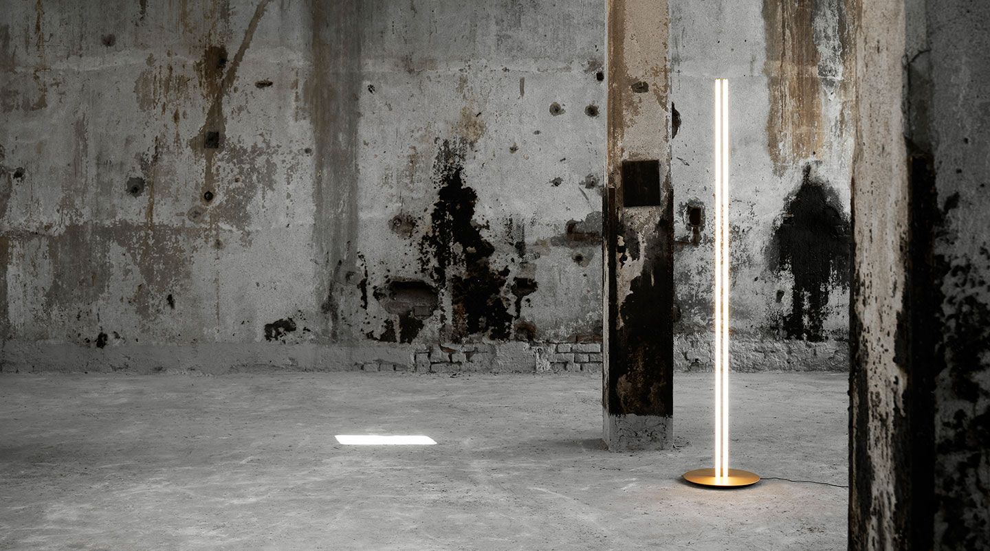 Напольный светильник Flos Coordinates F Champagne из двух вертикальных алюминиевых стержней золотистого цвета, которые можно ориентировать.